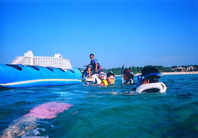 | ノンダイバー(シュノーケリング)班がドラゴンボートから降りた所。子供も大人も一緒です。みんなで一緒にサンゴ苗の植え付けの所へ泳いで行きます。 |
