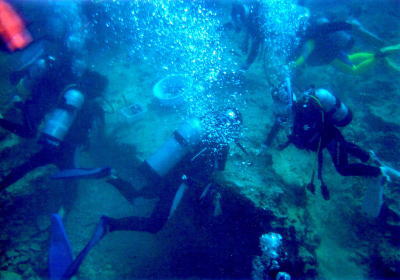 ダイバー班が水深5〜10mの所でサンゴの苗を植え付けている所が見えます。 |